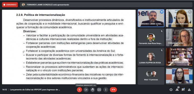Por meio da Vice-Reitoria de Pós-Graduação, Pesquisa e Extensão da Unijuí, foi realizado na tarde desta quarta-feira, dia 11 de agosto, de forma online, o lançamento do Edital nº 21/2021, que trata da seleção de candidatos estrangeiros para ingresso como estudantes regulares em cursos de Mestrado ou Doutorado na Instituição.
