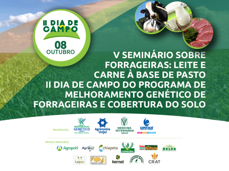 Acontece nesta sexta-feira, 8 de setembro, o 2º Dia de Campo do Programa de Melhoramento Genético de Forrageiras e Cobertura de Solo e o V Seminário sobre Forrageiras: Leite e Carne à Base de Pasto. O evento acontecerá a partir das 7h30 na Escola Fazenda - IRDeR, no município de Augusto Pestana. O evento é uma promoção da Unijuí, juntamente com o Programa de Melhoramento Unijuí e os cursos de Agronomia e Medicina Veterinária.