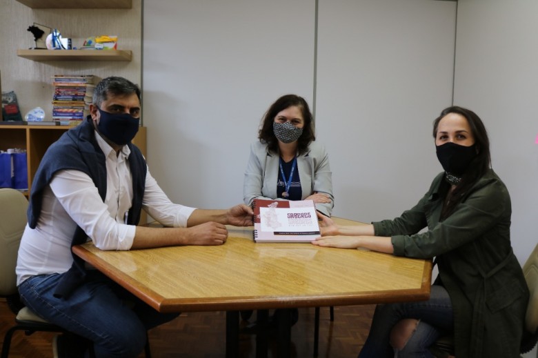 O vice-reitor de Pós-Graduação, Pesquisa e Extensão da Unijuí, professor Fernando Jaime González, e a assessora de Extensão e Cultura da pasta, Sirlei Noemi Schneider, receberam na última terça-feira, 5 de outubro, o Catálogo Saberes e Sabores Étnicos de Ijuí. A entrega do material foi realizada pela turismóloga do Município, Bianca Angelica Gessi Caneppele.