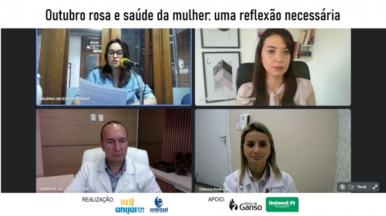 Para debater a temática “Outubro Rosa e saúde da mulher: uma reflexão necessária”, os convidados do Rizoma Temático desta quinta-feira, 14 de outubro, foram a professora do curso de Enfermagem da Unijuí e coordenadora do Programa de Pós-Graduação em Oncologia, Bruna Nadaletti; o médico ginecologista e mastologista, professor do curso de Medicina, Gerson Delazeri; e a psicóloga do Centro de Oncologia da Unimed Noroeste/RS, Débora Andrade.
