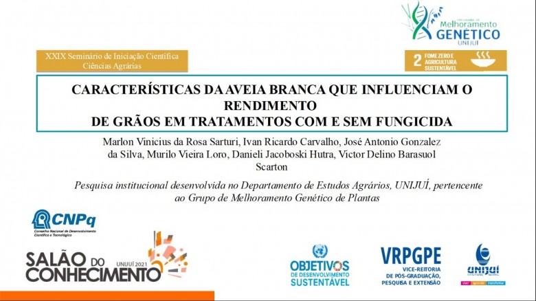 Um dos trabalhos apresentados trabalhou as “Características da aveia branca que influenciam o rendimento de grãos em tratamentos com e sem fungicida”. A pesquisa foi desenvolvida pelo estudante do 9º semestre de Agronomia e bolsista CNPq, do grupo de pesquisa de Melhoramento Genético Unijuí, Marlon Vinicius da Rosa Sarturi. O objetivo foi verificar as implicações de diferentes variáveis, correlacionadas ao rendimento de grãos da cultura de aveia, e quais destas variáveis sujeitaram-se a alterações pelos diferentes tratamentos.