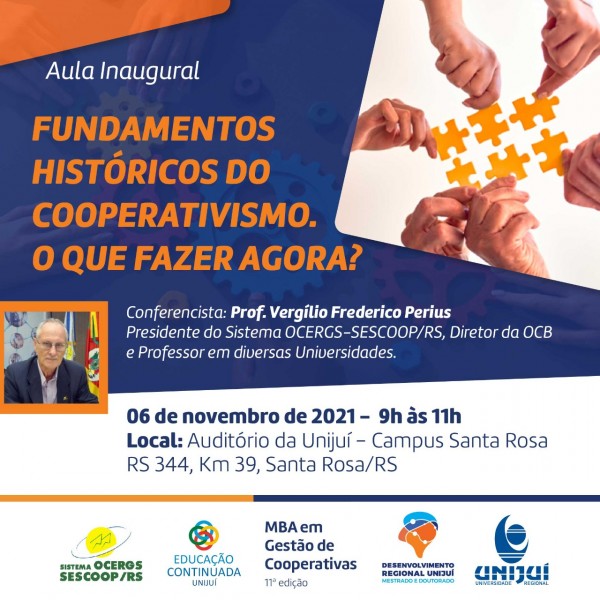 No próximo sábado, dia 6, a Unijuí Campus Santa Rosa recebe Vergílio Frederico Perius, presidente do Sistema Ocergs-Sescoop/RS, diretor da Organização das Cooperativas Brasileiras e professor universitário. A atividade é proposta para a aula inaugural da 11ª edição do MBA em Gestão de Cooperativas, mas é aberta à participação de toda a comunidade e será realizada no Auditório do campus Santa Rosa, com início às 9h. Vergílio falará sobre “Fundamentos históricos do cooperativismo. O que fazer agora?”.