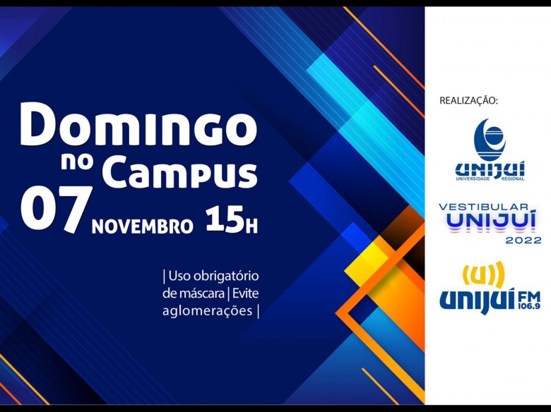 Neste domingo, dia 7 de novembro, a tarde será marcada pela volta do Domingo no Campus. Desde novembro de 2019, o evento promovido pela Unijuí FM e pela Unijuí não era realizado, especialmente em razão da pandemia de covid-19, que teve início em 2020. Neste fim de semana, a comunidade poderá curtir novamente as diversas ações levadas ao Campus Ijuí pelos cursos da Universidade, Cia Cadagy, Museu Antropológico Diretor Pestana (MADP) e apoiadores do evento.