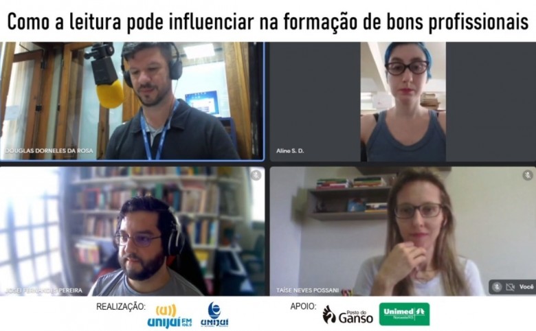 O Rizoma Temático da semana ocorreu excepcionalmente nesta quarta-feira, 10 de novembro, e trouxe como tema “Argumentação e raciocínio rápido: como a leitura pode influenciar na formação de bons profissionais”. Os convidados para o debate foram a mestre em Letras e coordenadora dos cursos de Letras: Português e Inglês, Pedagogia e História da Unijuí, Taíse Possani; o mestre em História e membro do Projeto Traças Digitais, Josei Fernandes; e a bibliotecária responsável pela Biblioteca Pública Municipal de Ijuí, Aline de Souza Diehl.