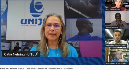 Na tarde desta sexta-feira, dia 26, a reitora da Unijuí, professora Cátia Maria Nehring, foi a mediadora do painel “Ambientes de inovação: desenvolvendo negócios e interagindo com a comunidade”. Participaram como painelistas: Artur Gibbon, presidente da Rede Gaúcha de Ambientes de Inovação (Reginp); Francisco Saboya, presidente da Associação Nacional de Entidades Promotoras de Empreendimentos Inovadores (Anprotec); Giovani Feltes, deputado federal; e Pedro Valério - CEO do Instituto Caldeira. O painel foi transmitido na íntegra pelo canal do YouTube do Comung.