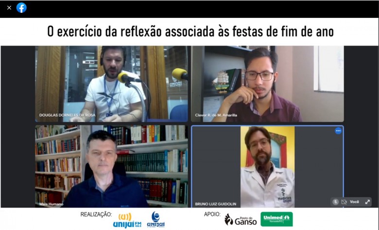 Para debater as mudanças ocasionadas pelo período, a partir do tema “Época de renascimento: o exercício da reflexão associada às festas de fim de ano”, o Rizoma Temático contou, nesta quinta-feira, 9 de dezembro, com a presença do psicólogo clínico e organizacional, Clever Ronaldo de Moraes Amarilha; com o médico psiquiatra e professor do curso de Medicina da Unijuí, Bruno Guidolin; e com o bacharel em Teologia, professor de Filosofia, jornalista e executivo de Comunicação Social, Marco André Regis.