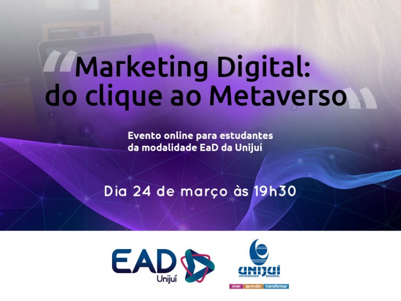 Na próxima quinta-feira, 24 de março, acontece a palestra “Marketing Digital: do clique ao Metaverso”, voltada aos estudantes da modalidade Ensino a Distância (EaD) da Unijuí. O evento será online e pode ser acessado às 19h30, no canal do Youtube da Unijuí.