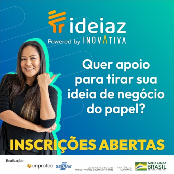 Realizado pela Associação Nacional de Entidades Promotoras de Empreendimentos Inovadores (Anprotec), Sebrae e Secretaria Especial de Produtividade e Competitividade do Ministério da Economia (Sepec/ME), o Ideiaz Powered by InovAtiva visa atender em escala e com abrangência nacional ideias e projetos de negócios inovadores e de impacto socioambiental, em estágio inicial, de todas as regiões do País.