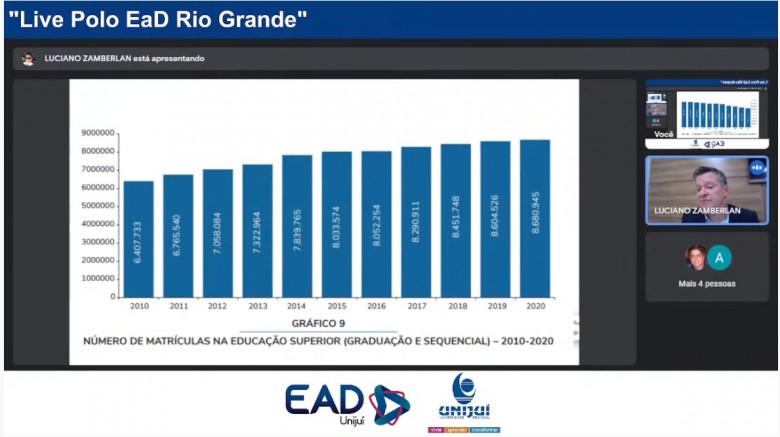 O coordenador dos cursos de Educação a Distância (EaD) da Unijuí, professor Luciano Zamberlan, participou na noite desta quinta-feira, 6 de maio, de uma live direcionada aos estudantes do Ensino Médio de Rio Grande. A atividade foi realizada em parceria com o Colégio Alternativo, parceiro na implantação do Polo EaD Unijuí na cidade.