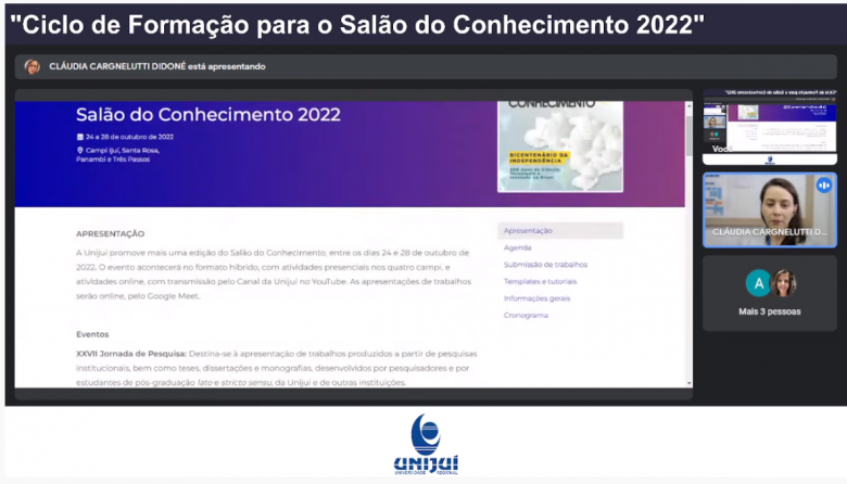 Neste ano, o Salão do Conhecimento vai trabalhar a temática “Bicentenário da Independência: 200 anos de Ciência, Tecnologia e Inovação no Brasil”, que converge com a 19ª Semana Nacional da Ciência e Tecnologia, promovida pelo Ministério da Ciência, Tecnologia e Inovações. “Nos últimos dois anos, realizamos o evento de forma totalmente virtual e, neste ano, voltamos a ter atividades presenciais. Ainda não estamos com as inscrições abertas, mas interessados em realizar a submissão de trabalhos, resumos expandidos e trabalhos completos, já podem conferir as normas e templates disponíveis na página unijui.edu.br/eventos”, destacou a assessora da Vice-reitoria de Pós-Graduação, Pesquisa e Extensão da Unijuí, Cláudia Didoné.