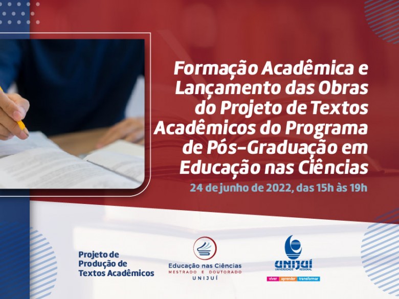 Nesta sexta-feira, 24 de junho, das 15h às 19h, acontecerá o evento de Formação Acadêmica e Lançamento de Obras do Projeto de Produção de Textos Acadêmicos, que é vinculado ao Programa de Pós-Graduação Stricto Sensu em Educação nas Ciências da Unijuí. O evento acontecerá no Centro de Eventos da Universidade e terá transmissão ao vivo pelo Youtube da Unijuí, neste link.