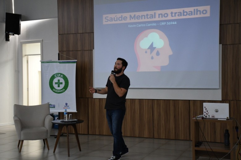 Nesse sentido, o tema que norteou a primeira palestra da semana foi “Saúde mental no trabalho”, com o psicólogo Kevin Camilio. Ele ressaltou que saúde mental, de certa forma, equivale ao bem estar do sujeito, e explicou como o trabalho está relacionado com essa questão. “O trabalho faz parte da identidade do sujeito. Quando ele não consegue se encontrar no trabalho, há muitas chances de um adoecimento psíquico. Por isso, a saúde mental é tão importante no ambiente de trabalho: ela impacta nas suas realizações do trabalho e as realizações do trabalho impactam no seu ambiente familiar”, afirmou o psicólogo.