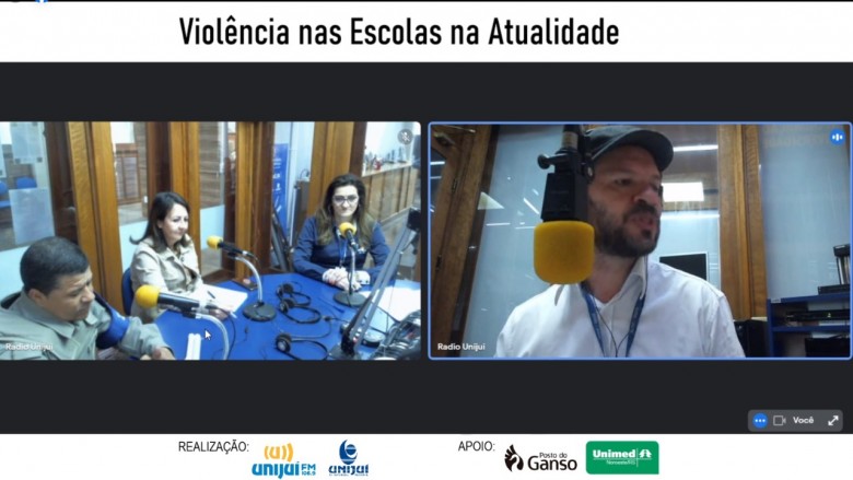 Para debater a "Violência nas escolas na atualidade", o Rizoma Temático desta quinta-feira, 8 de setembro, convidou o representante do Programa Educacional de Resistência às Drogas e à Violência (Proerd), tenente Cleomar Maciel; a assessora da Rede de Proteção na Secretaria Municipal de Educação (Smed) e pós-graduada em Gestão e Organização da Escola, professora Neiva Maria Pereira da Silva; e a responsável pelo setor de apoio escolar da 36ª Coordenadoria Regional de Educação e assessora regional das Comissões Internas de Prevenção de Acidentes e Violência Escolar (Cipave), professora Ângela de Fátima Linck de Jesus.