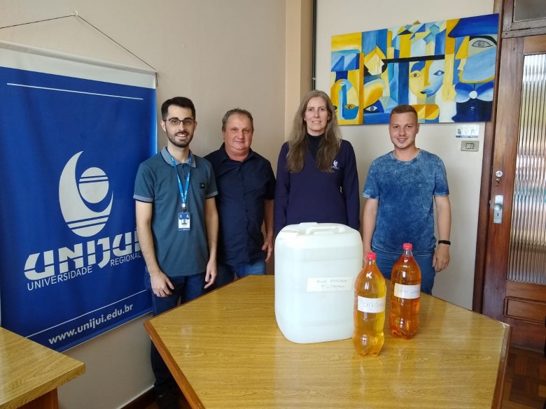 Nesta terça-feira, dia 13 de setembro, estiveram reunidos, no campus Três Passos da Unijuí, o coordenador do campus, professor André Giovane de Castro; a coordenadora de Pesquisa e Desenvolvimento da Agência de Inovação Tecnológica da Unijuí (Agit), Fabiana Simon; e os sócios da Indústria de Óleos e Essências Aromáticas de Três Passos, Dirceu e Pedro Diel. O encontro teve como objetivo abordar assuntos relacionados à execução do projeto de pesquisa “Uso de óleo essencial no tratamento de saúde humano, animal e vegetal”.