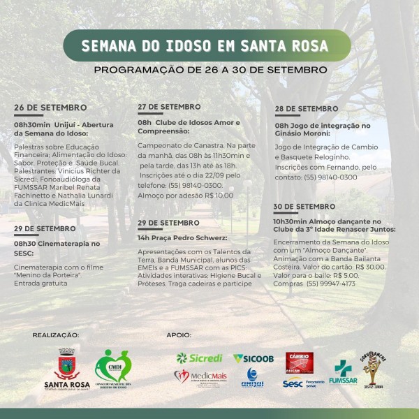 A programação da Semana do Idoso em Santa Rosa segue até esta sexta-feira, dia 30 de setembro, com a realização de diversas atividades em diferentes locais da cidade. Confira o cronograma completo abaixo.