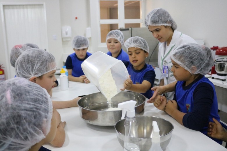 Alunos do 2º Ano da Escola Municipal de Educação Infantil e Ensino Fundamental João Goulart participaram na tarde desta segunda-feira, 24 de outubro, de uma atividade especial no Laboratório de Panificação e Confeitaria da Unijuí. A oficina de pão integrou 22 estudantes do educandário, além da professora Cristina Galarce e da auxiliar Elisa, por meio da disciplina de Projeto Integrador, que reúne acadêmicos de diferentes cursos da Universidade, com o objetivo de desenvolver estratégias de atenção à saúde a esta turma.