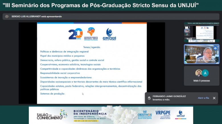 Nesta quarta-feira, 26 de outubro, foi realizado o III Seminário dos Programas de Pós-Graduação Stricto Sensu da Unijuí, durante o Salão do Conhecimento. Ao longo do dia, foram realizados diversos painéis com a participação dos professores dos PPGs de Atenção Integral à Saúde; Desenvolvimento Regional; Direito; Educação nas Ciências; Modelagem Matemática e Computacional; e Sistemas Ambientais e Sustentabilidade.