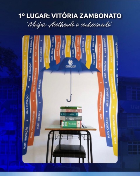 Vencedora na categoria Olhar Atual, a assistente do Núcleo de Práticas Jurídicas da Unijuí, Vitória Zambonato, relatou a ideia por trás da foto que lhe rendeu o prêmio. “Desde que o adesivo do guarda-chuva foi aplicado no Escritório Modelo eu achei ele muito bonito, porém, além da beleza visível, me pus a refletir sobre seu significado. Quando o concurso foi lançado, logo pensei neste espaço e em como eu poderia mostrar o que a Unijuí e ele significam. Como egressa da instituição, relembrei minha trajetória acadêmica, a qual quis representar pelos livros do curso de Direito e, com o título da foto, ‘Unijuí: acolhendo o conhecimento’, sintetizei o que a Universidade representa para mim: ela me acolheu como acadêmica, fornecendo o conhecimento que me fez bacharela em Direito, e também me acolheu como funcionária em meu primeiro emprego. Sou feliz por ter feito e ainda fazer parte de uma instituição tão acolhedora”, destacou Vitória.