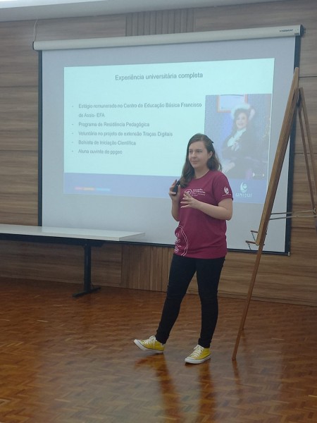 Durante o evento ocorrido no campus Ijuí, Joice, que também é egressa do curso de Pedagogia da Unijuí, abordou sua trajetória acadêmica na Instituição. “Participei de várias oportunidades na Unijuí. Inicialmente, como estagiária no Centro de Educação Básica Francisco de Assis (EFA), atuando nos anos iniciais e educação infantil. Logo após, participei como bolsista e também por um período como voluntária, do Programa de Residência Pedagógica financiado pela Capes, que visa o aprimoramento dos licenciandos e concomitantemente, participei como voluntária do Projeto de Extensão “Traças Digitais: Audiolivros para a formação de leitores, professores e comunidade”.