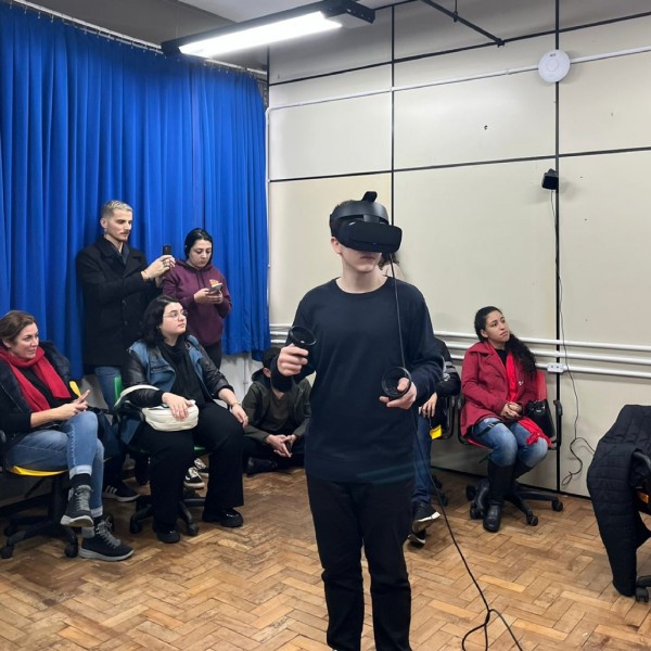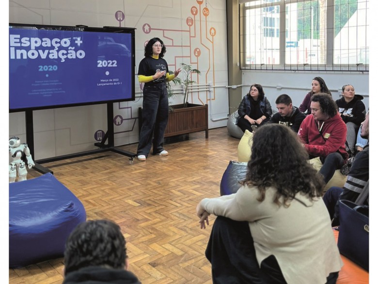 Logo após, a turma foi recebida pelos colaboradores do Espaço Mais Inovação Unijuí, para experienciar novas formas de tecnologia associadas à comunicação. O Espaço faz parte do Projeto Ampliação e Qualificação do “Centro de Inovação e Criatividade para uma Cidade Inteligente”, termo de fomento nº 90543/2020, Ministério da Ciência, Tecnologia e Inovações.