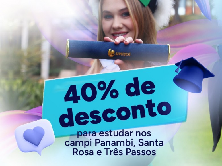 A Unijuí oferecerá novamente um programa de descontos exclusivos para o Vestibular de Inverno 2023. Quem realizar o vestibular nos campi de Santa Rosa, Três Passos ou Panambi, e for aprovado, terá 40% de desconto no primeiro semestre do curso.
