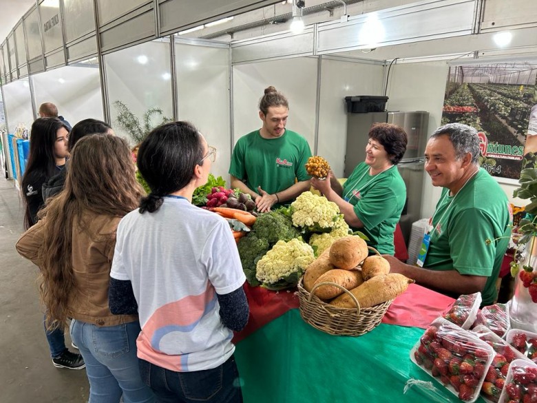 Conforme explicou a professora Karina, a Organização Mundial da Saúde (OMS) recomenda a ingestão de no mínimo 400 gramas de frutas e vegetais por dia. No entanto, a média atual está muito longe da esperada. “Nossa conversa foi no sentido de promover uma alimentação adequada através do consumo de alimentos in natura, minimamente processados”, explicou a professora. Junto com as estudantes, Karina percorreu o pavilhão da agricultura familiar e buscou conversar com representantes das agroindústrias, a fim de conhecer o trabalho desenvolvido e os produtos que são comercializados.