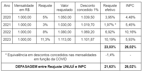 Além disso, é necessário considerar ainda que a defasagem entre os reajustes praticados pela UNIJUÍ e a variação do INPC é muito maior ainda, uma vez que, com a Graduação Mais, o valor das mensalidades dos cursos a partir de 2021 sofreu uma redução significativa pela aplicação de novos percentuais de Bolsas Lineares de Gratuidade.