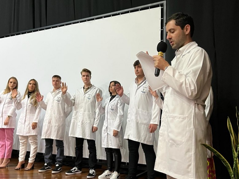 Na sequência, ocorreu a palestra “Excelência na profissão e qualidade de vida”, com o professor doutor Adelar Francisco Baggio. Por fim, o professor Jorge Brust deu as orientações necessárias sobre o uso do jaleco, considerado um importante Equipamento de Proteção Individual (EPI).