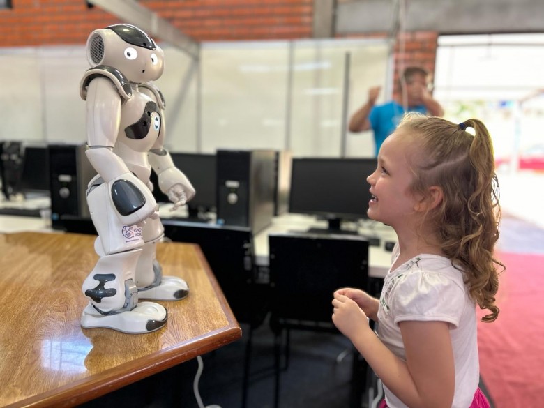 Desde a manhã até a tarde, o Espaço + Inovação Unijuí promoveu interações com o público, apresentando o robô NAO e convidando os visitantes a experienciar os óculos de realidade virtual.