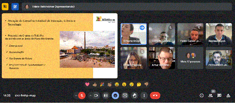 Com o objetivo de debater ações de reconstrução do Rio Grande do Sul, a Secretaria de Inovação, Ciência e Tecnologia (Sict) e o Conselho Estadual de Inovação, Ciência e Tecnologia criaram grupos de trabalho compostos por integrantes do Sistema Gaúcho de Ciência, Tecnologia e Inovação que devem propor projetos multidisciplinares, dentro das temáticas elencadas.
