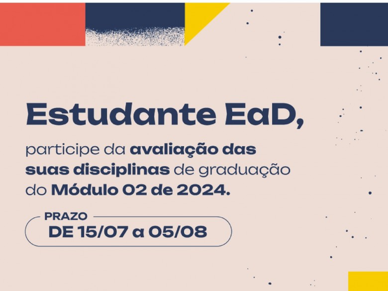 Até o dia 5 de agosto, os estudantes da modalidade Educação a Distância (EaD) poderão avaliar as disciplinas da graduação do Módulo 2. Para isso, basta acessar o Portal do Estudante e clicar no banner da pesquisa.