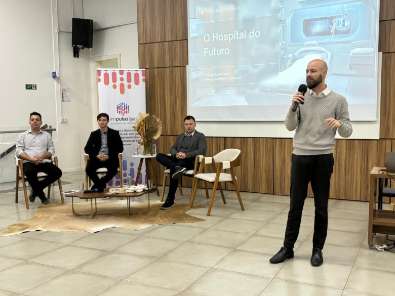 A noite contou com palestras de Thomas Troian, coordenador de Inovação e Consultoria no Hospital Moinhos de Vento, sobre o hospital do futuro; de Guilherme Barros, CEO da Sisqualis; e de Daniel Moreira, analista de Inovação sênior do Hospital São Lucas da PUCRS, que trouxeram o tema da interoperabilidade.