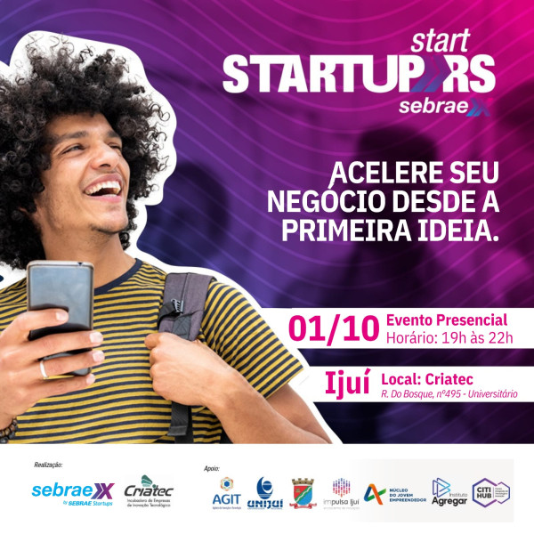 Estão abertas as inscrições para a 3ª edição do Programa Startup RS Start Ijuí, que será rodado pela Incubadora de Empresas de Inovação Tecnológica - Criatec da Unijuí e SebraeX. O programa é destinado às startups, empresas tecnológicas em estágio inicial e potenciais empreendedores que buscam a estrutura e validação dos seus modelos de negócios. As vagas são limitadas e gratuitas, e podem ser realizadas neste link.