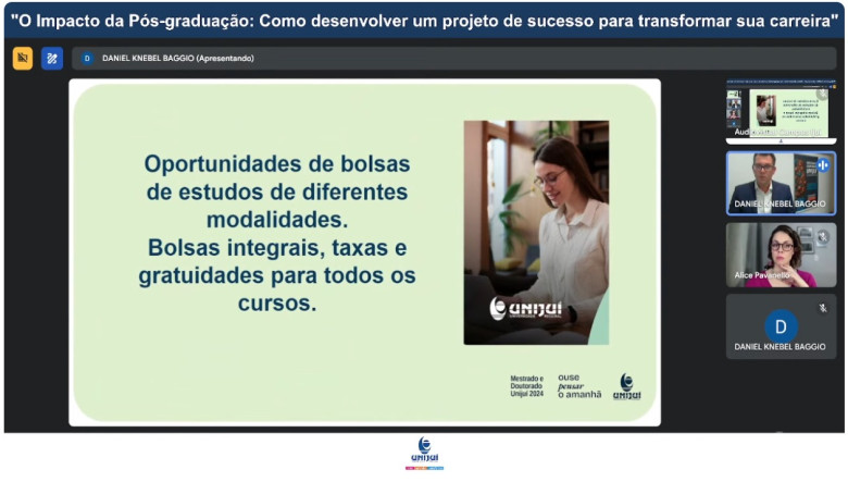A Unijuí lançou na noite desta quarta-feira, 11 de setembro, sua campanha de Pós-Graduação Stricto Sensu 2025, com o mote “Ouse pensar o amanhã”. O evento foi realizado de forma on-line e contou com a palestra “O impacto da Pós-graduação: como desenvolver um projeto de sucesso para transformar a sua carreira”, que ficou a cargo da doutora em Comunicação Midiática, Alice Pavanello, criadora do canal no Youtube “Além do Lattes”, com mais de 100 mil inscritos.