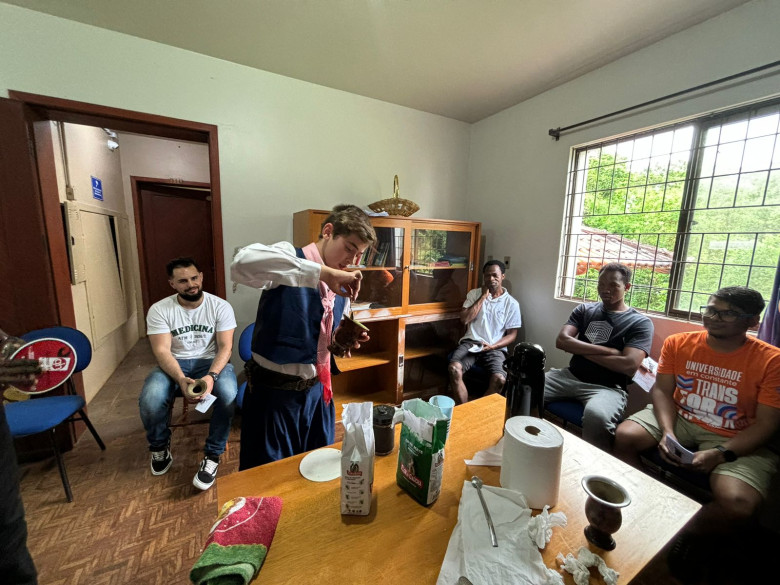 A atividade reuniu estudantes intercambistas que residem no local e também estudantes que vêm de outras cidades do Brasil para estudarem na Unijuí. A atividade foi ministrada pela assistente social Aline Luttke, e por Miguel Lutke Miron, que faz parte da invernada mirim do CTG Clube Farroupilha. A proposta foi apresentar como é feito o chimarrão para os estudantes e ensinar a sua preparação.