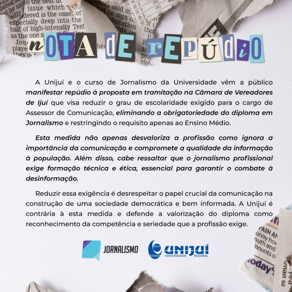 A Unijuí e o curso de Jornalismo da Universidade vêm a público manifestar repúdio à proposta em tramitação na Câmara de Vereadores de Ijuí que visa reduzir o grau de escolaridade exigido para o cargo de Assessor de Comunicação, eliminando a obrigatoriedade do diploma em Jornalismo e restringindo o requisito apenas ao Ensino Médio.