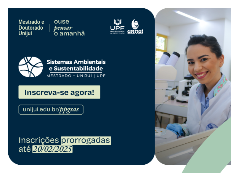 O Programa de Pós-Graduação Stricto Sensu em Sistemas Ambientais e Sustentabilidade ofertado em associação entre a Unijuí e a Universidade de Passo Fundo (UPF), está com inscrições abertas para o curso de Mestrado. No total, são ofertadas 15 vagas. As inscrições podem ser realizadas até o dia 20 de fevereiro, neste link.