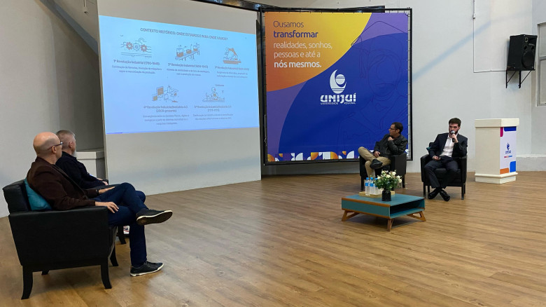 Transformação digital e inteligência artificial foi a temática da primeira noite de evento. O debate girou em torno de como a Inteligência Artificial está redefinindo as profissões e habilidades tecnológicas indispensáveis para se destacar em diferentes áreas. A palestra foi conduzida pelo Prof. Mestre Marco Antonio Compassi Brun, Prof. Dr Gerson Battisti, Prof. Mestre Marcelo Luís Didoné e Prof. Mestre Diorges Carlos Lopes.