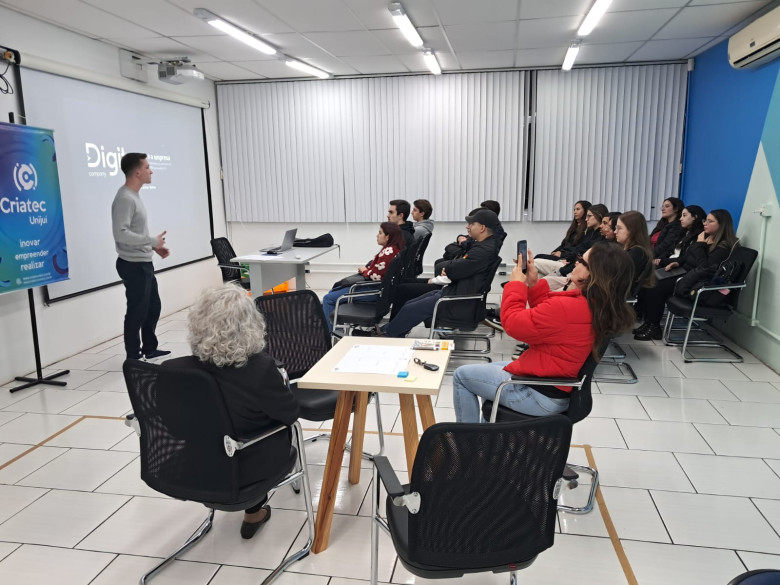 Na ocasião, a coordenadora da Criatec, Maria Odete Palharini, deu início às atividades apresentando a incubadora, suas iniciativas, projetos e sua relevância no ecossistema de inovação. Em seguida, Arthur Matter, proprietário da Digit Company, compartilhou sua trajetória como empreendedor e ex-incubado da Criatec, destacando os diferenciais da empresa no mercado. Por fim, Juliana Capssa Sausen, gestora de Inovação e Tecnologia do Programa Startup Lab – Região Noroeste e Missões, conduziu o workshop sobre o Modelo Canvas, com explicações práticas e exemplos de aplicação. Após a explanação, os estudantes foram divididos em grupos para estruturar e apresentar seus próprios modelos de negócios.