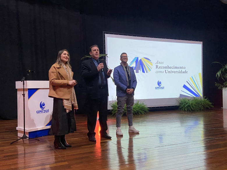 Os 40 anos de reconhecimento da Unijuí como Universidade, os 40 anos da Editora Unijuí e o centenário de nascimento de Mario Osorio Marques foram novamente celebrados nesta quarta-feira, 2 de julho. A solenidade especial contou com a presença de professores, técnicos-administrativos e de apoio, e aconteceu no Salão de Atos, conduzida pelo reitor, professor Dieter Rugard Siedenberg, com a participação de dois anfitriões: Théo e Eva, personagens criados por Inteligência Artificial (IA).