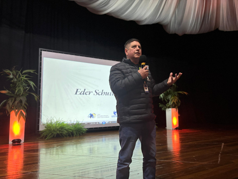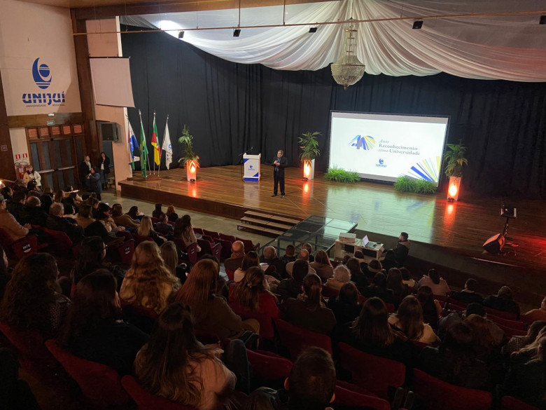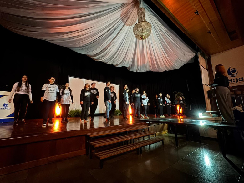 Após a apresentação do Coral Unijuí, o evento foi apresentado por Théo e Eva, a partir de um roteiro construído com base nos valores que guiam a Universidade: ética, comprometimento, valorização das pessoas, profissionalismo, responsabilidade social e qualidade. Esses princípios nortearam os relatos de colaboradores convidados a compartilhar suas histórias, entrelaçadas à construção da Universidade.