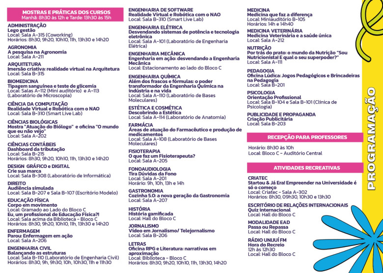 Com uma programação interativa e dinâmica, o Profissional do Futuro vai ocorrer das 8h30 às 12h e das 13h30 às 15h30, e conta com uma experiência completa: além de conhecer de perto os cursos de graduação da Unijuí, os estudantes poderão vivenciar oficinas práticas, explorar áreas de atuação e tirar dúvidas com professores, acadêmicos e a equipe da Universidade. Tudo isso em um ambiente acolhedor e descontraído, com música ao vivo e food trucks disponíveis ao longo do dia.