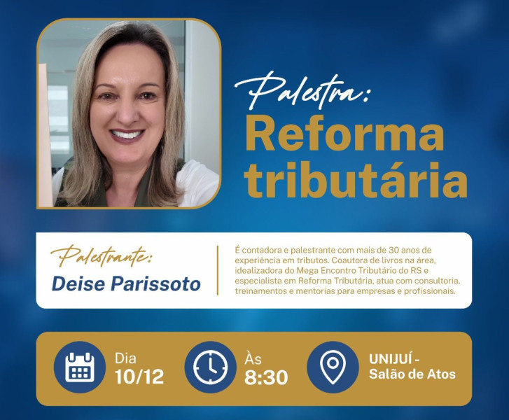 A palestra será ministrada pela contadora Deise Parissoto, a qual é palestrante com mais de 30 anos de experiência em tributos, coautora de vários livros na área, especialista em Reforma Tributária, e atua com consultoria, treinamentos e mentorias para empresas e profissionais. A mediadora da palestra será Roselaine Filipin