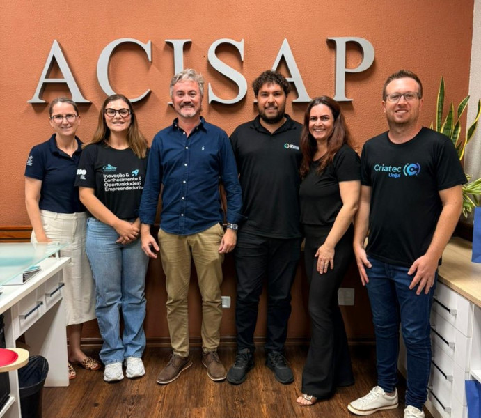 No período da tarde, Juliana e Samanta, acompanhadas de Lucas Escher, coordenador da Criatec Santa Rosa, estiveram na Acisap, em reunião com Cássio Feltes, presidente da entidade, Felipe Carpenedo, coordenador do Programa Agromove, e Ana Maschio, executiva da Acisap. O encontro teve como foco o alinhamento de estratégias, a ampliação do engajamento regional e o fortalecimento de parcerias institucionais, visando potencializar a adesão das empresas locais ao novo ciclo do Programa.