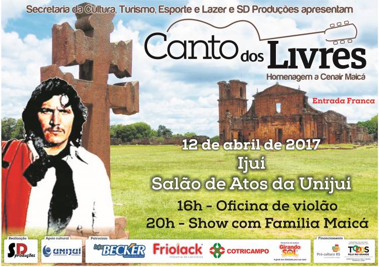 Cenair Maicá, tronco missioneiro, expoente da música gaúcha ao lado de nomes como Jaime Caetano Braun, Noel Guarany e Pedro Ortaça, será homenageado no Salão de Atos Argemiro Jacob Brum, no dia 12 de abril. O show, intitulado Canto dos Livres, terá entrada franca, porém, o acesso será garantido mediante a apresentação de convite, que está disponível na recepção do Campus Ijuí na Coordenadoria de Marketing da Unijuí.