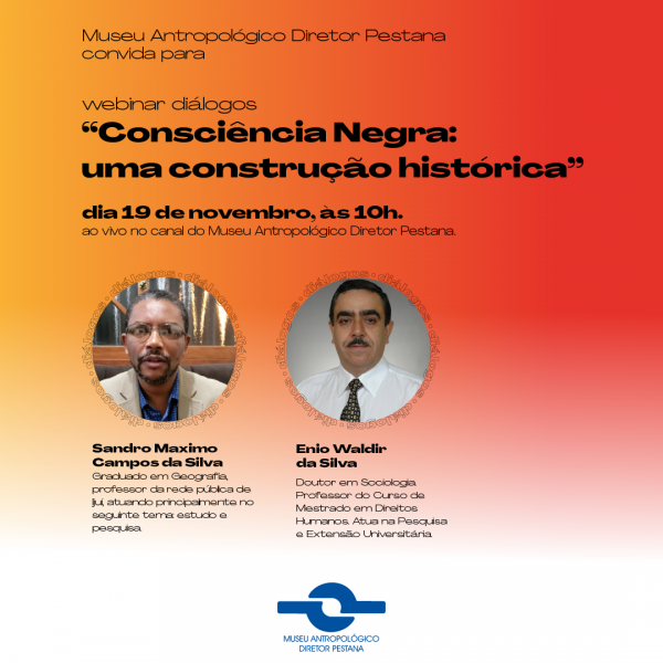 O Museu Antropológico Diretor Pestana convida para o webinar diálogos “Consciência negra: uma construção histórica”. A palestra online contará com a presença do professor Sandro Maximo Campos da Silva, graduado em Geografia e professor da rede pública de Ijuí, atuando principalmente no tema estudo e pesquisa; Enio Waldir da Silva, Doutor em Sociologia, professor do Curso de Mestrado em Direitos Humanos, onde atua na Pesquisa e Extensão Universitária fará a mediação.