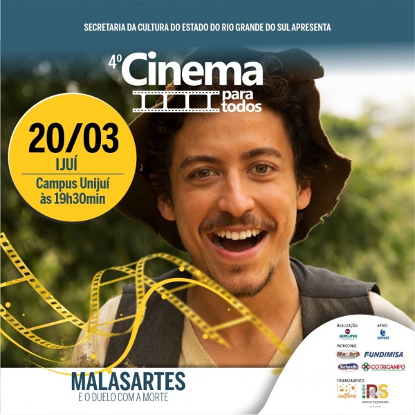 No próximo domingo, dia 20 de março, a Unijuí terá a exibição do filme “Pedro Malasartes e o Duelo com a Morte”, junto ao estacionamento dos ônibus, no campus da Universidade. A sessão faz parte do 4º Cinema para Todos, promovido pela Secretaria da Cultura do Estado, e acontece em Ijuí por meio da parceria entre a Unijuí e a Produtora Cultural Nova-Produções. A iniciativa é financiada pelo Pró-Cultura RS e Governo do Estado do Rio Grande do Sul.