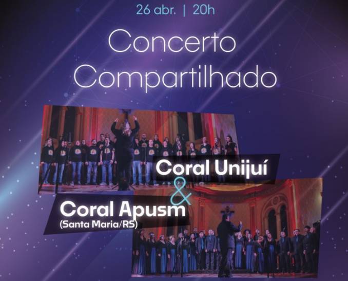 No dia 26 de abril, sexta-feira, a Unijuí e o Coral da Apusm (Santa Maria) vão realizar uma apresentação conjunta, no Auditório do Sesc, em Ijuí, às 20h. Os ingressos estão disponíveis nos caixas da Unijuí e com integrantes do Coral ao valor de 15,00 reais, sendo que estudantes, idosos e pessoas com necessidades especiais pagam meia entrada, no valor de 8,00 reais.