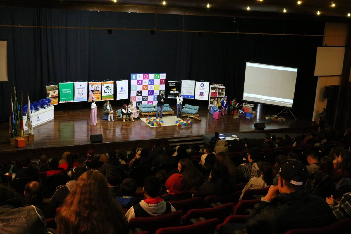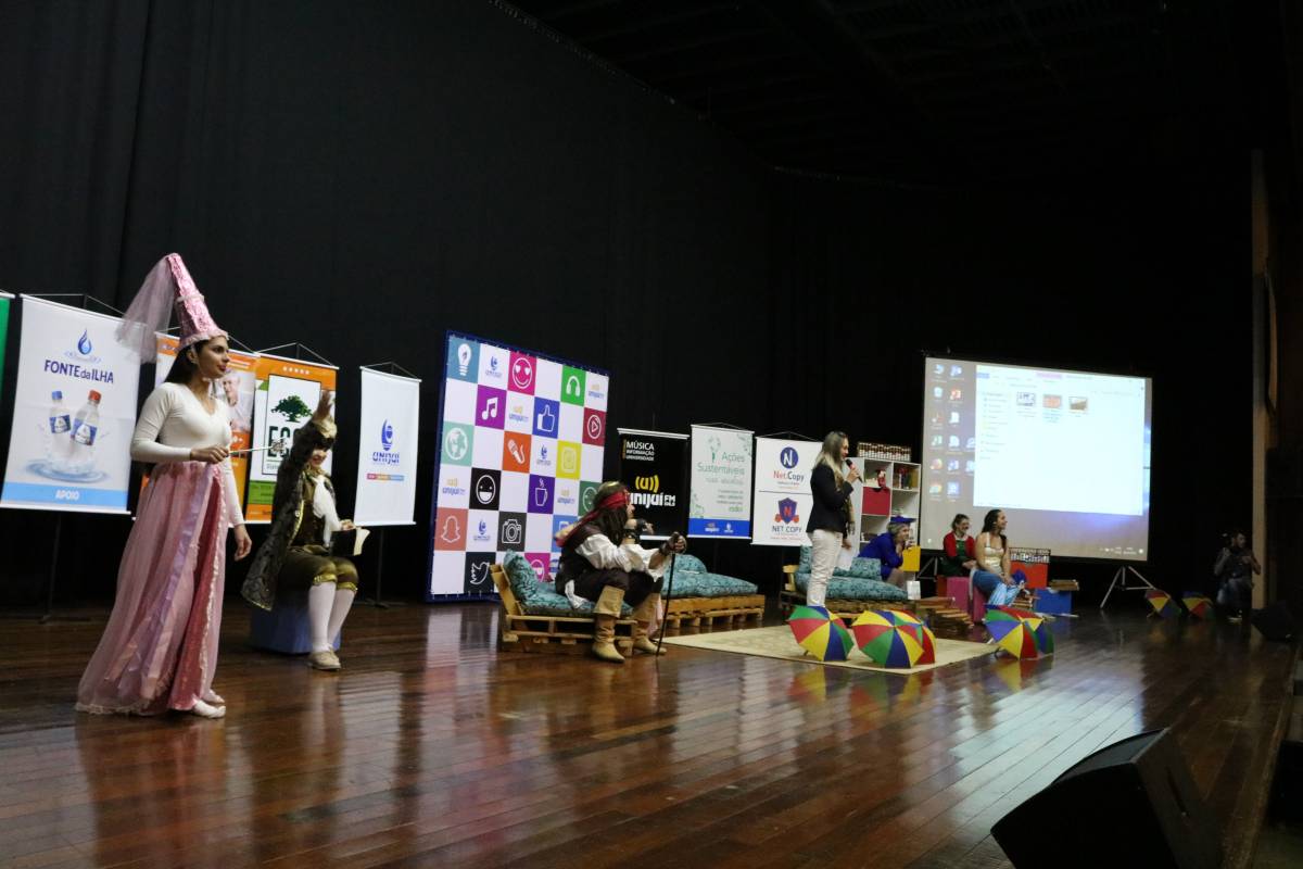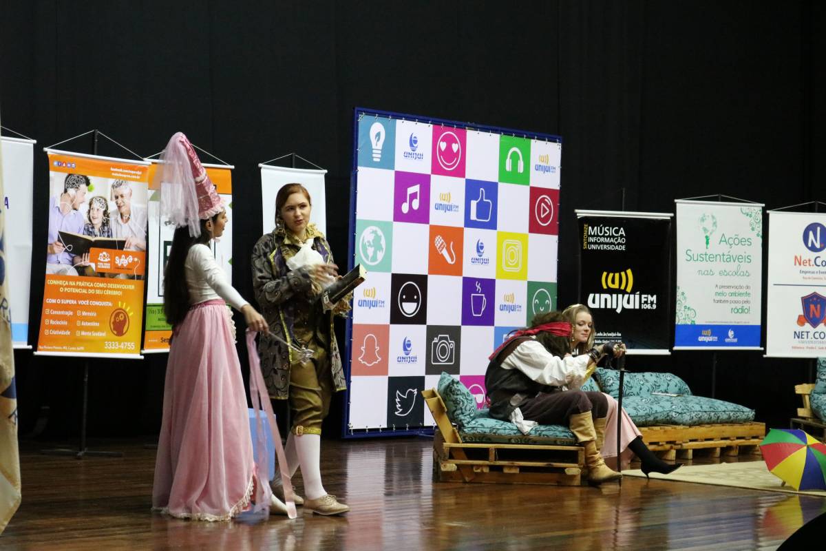 Mais de 400 alunos do 6º ao 9º ano de escolas de Ensino Fundamental de Ijuí participaram da manhã de hoje da cerimônia de premiação do Concurso Literário “Eu, Meu Personagem e o Meio Ambiente”, promovido pela Rádio Educativa UNIJUÍ FM e UNIJUÍ, por meio do curso de Letras. A atividade integra o projeto Ações Sustentáveis nas Escolas de Ijuí, aprovado em edital da Secretaria Municipal de Meio Ambiente e Consema Ijuí, e teve apoio da Unimed Noroeste RS, Fonte da Ilha, Ecos Sistema de Ensino, Supera Ginástica para o Cérebro, Literatus Xok’s, NetCopy, Criatec e JH Ofertão. Personagens direto dos contos de fadas e histórias ficcionais povoaram o palco da apresentação, sendo interpretados por voluntários do curso de Pedagogia e Cia Cadagy.