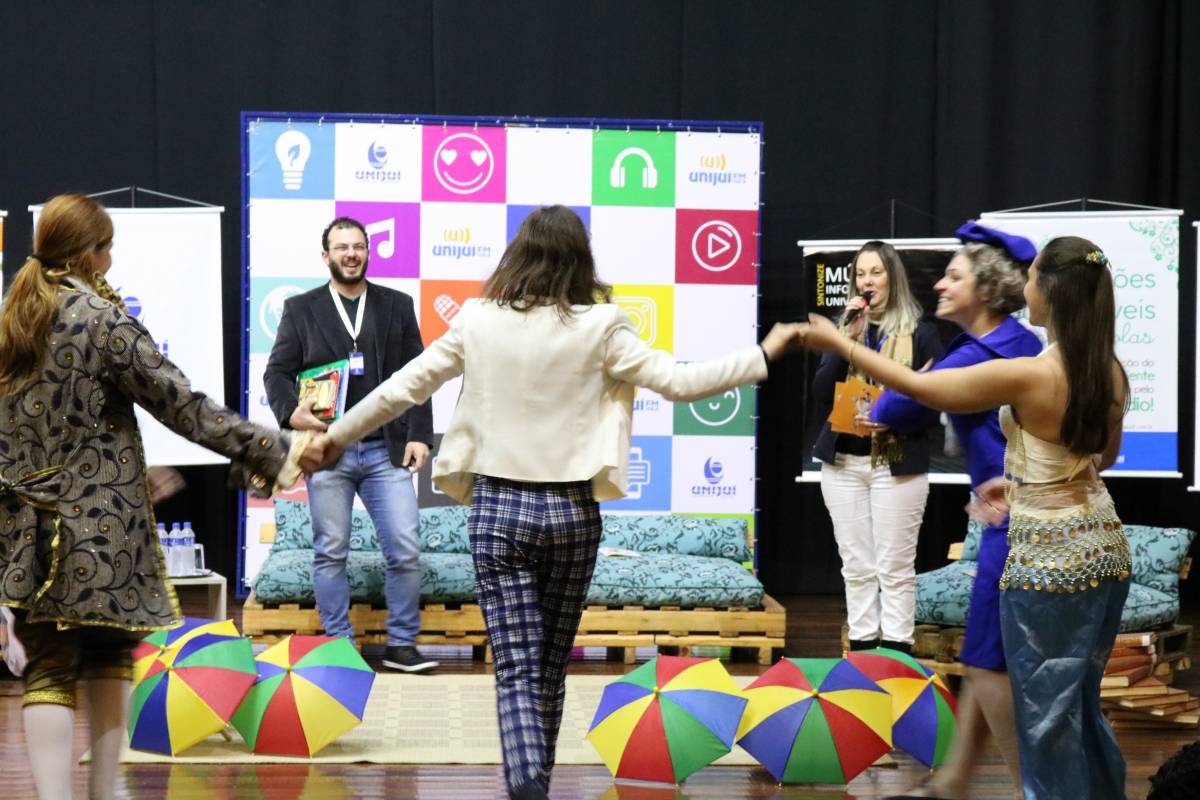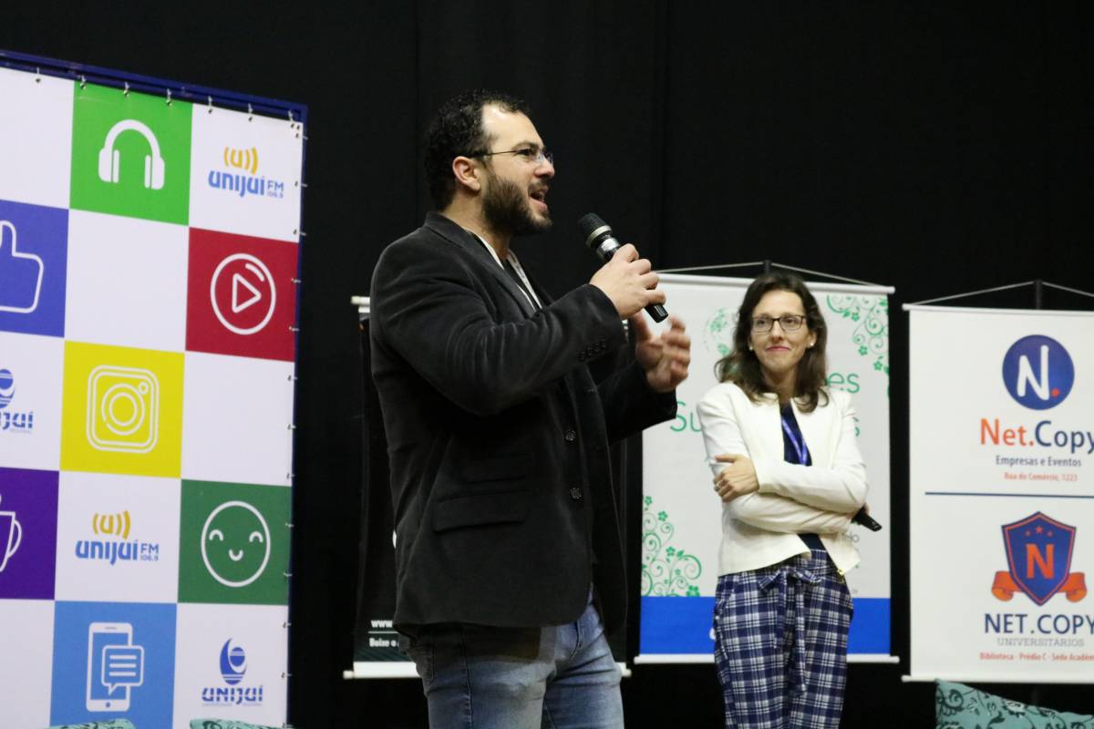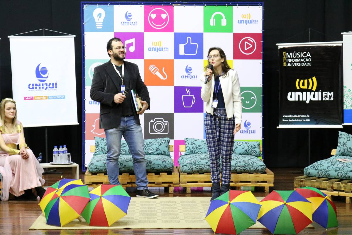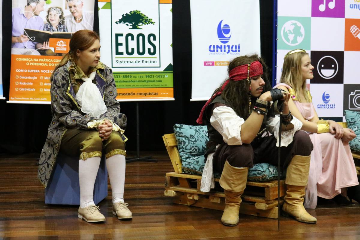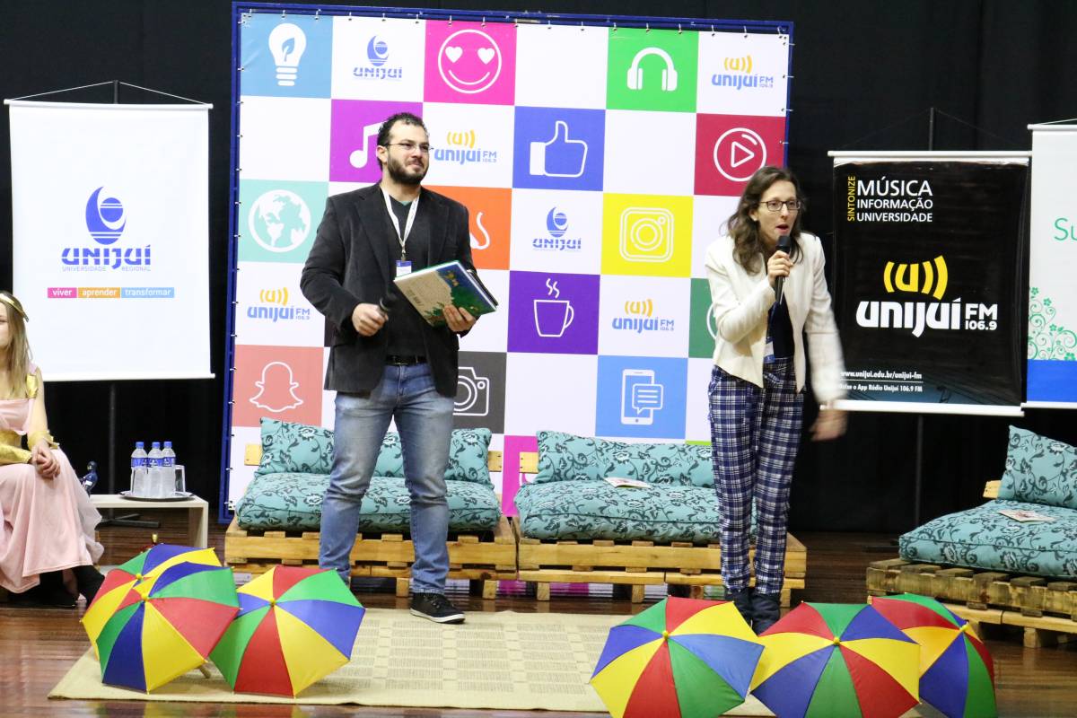 Num primeiro momento, os professores do Departamento de Humanidades e Educação da UNIJUÍ, Anderson Amaral de Oliveira e Taíse Neves Possani bateram um papo com o público presente sobre leitura e literatura, falando sobre personagens dos quadrinhos, do folclore, de superproduções do cinema e sobre personalidades conhecidas da história, da arte, da filosofia e da ciência. "No momento em que lemos os textos, estávamos atentos buscando a qualidade do texto e da ficção e um diferencial autoral. E muitos alunos resgataram personagens de suas leituras e se engajaram na proposta”, explica Taise. A relação dos jovens escritores com o mundo das palavras foi destacada na fala do professor Anderson. “É uma satisfação imensa ficar atento ao que os jovens estão pensando, como estão escrevendo e como estão se apropriando da literatura, como este mundo ficcional está fazendo parte do mundo deles”, destaca.